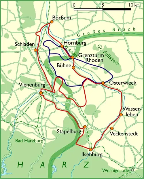 Zwischen den früheren Grenzflüssen Ilse und Oker, von Hornburg im Norden bis Ilsenburg im Süden, erstreckt sich im flachen bis leicht hügeligen Gelände des Harzvorlands eine rund 70 Kilometer lange Fahrradrundroute mit leichtem Schwierigkeitsgrad.