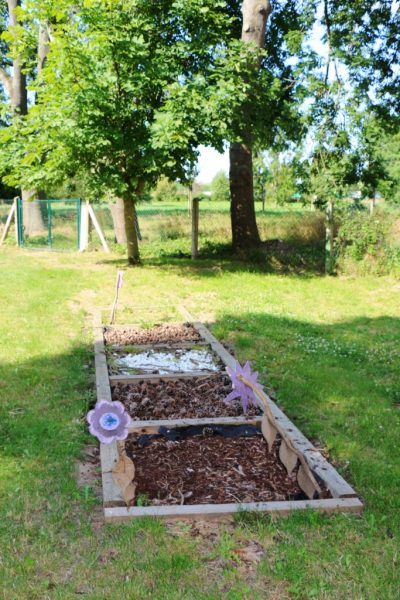 Unsere Kindertagesstätte befindet sich auf dem Gelände einer ehemaligen Wasserburg. Wir haben das Glück, eine wunderschöne und große Außenanlage mit vielen Spiel- und Bewegungsmöglichkeiten zu besitzen. Im Jahr 2018 haben wir zwei neue Spiellandschaften erhalten, die von den Kindern sehr gern genutzt werden. Weiterhin befindet dort  sich auch unser Kaninchen- und Hühnergehege sowie unser „Grünes Klassenzimmer“, unser Garten, den wir gemeinsam mit den Kindern bewirtschaften.