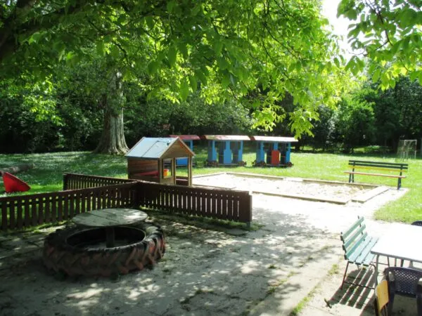 Zu unserer KITA gehört eine etwa 1000 qm parkähnliche Außenfläche; mit 2 kleinen Rodelbergen, ein harmonischer Wechsel von Sand- und Wiesenflächen, einer Sandkiste, ein großer Rutschturm mit Schaukel, zwei kleinen Rutschen, ein Spielhaus, zwei Fußballtore, ein Barfußpfad, eine große Nestschaukel und eine Eisenbahn mit Wagons. Aber auch natürliche Rückzugsmöglichkeiten und viele Kletterbäume regen die Phantasie und Spielfähigkeit der Kinder an.