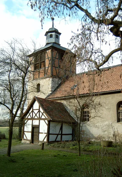 Die Kirche, welche früher unter dem Patronat des Kloster Ilsenburg, dann der Grafen von Wernigerode, darauf der Dompröpste stand, wurde während des dreißigjährigen Krieges 1618 – 1648 weitgehend zerstört. Über ihren 1718 geschehenen Neubau gibt es eine außen an der Kirche angebrachte Tafel mit einer Inschrift. Beim Lesen fällt auf, dass einzelne Buchstaben durch ihre Größe hervorgehoben sind. Es handelt sich um ein Chronogramm, dies es ist eine typische Form spielerischen Versteckens einer Jahreszahl in einem Text.