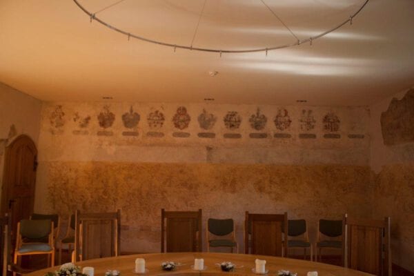 Der liebevolle und bis aufs kleinste Detail restaurierte Raum besticht durch seine wunderschönen Malereien der Spätrenaissance.
