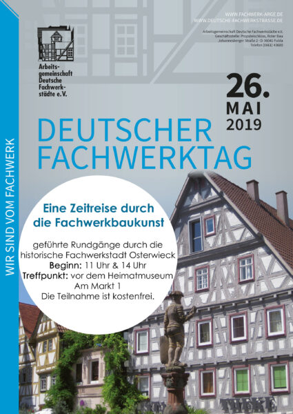 Die Osterwiecker Gästeführer laden zu diesem Anlass am Sonntag, den 26. Mai zu Themenführungen durch die kleine Fachwerkstadt Osterwieck ein. Während des etwa 90-minütigen Rundgangs durch die Altstadt können die Teilnehmer eine kleine Zeitreise durch die Fachwerkbaukunst aus fünf Jahrhunderten erleben. Außerdem gewinnen die Besucher einen Eindruck davon, welche Bedeutung die historische Fachwerkstadt im Zeitalter der Reformation innehatte. Die zahlreichen Inschriften an den Fachwerkhäusern der Stadt lassen erkennen, dass sich Osterwieck schon früh zur Reformation bekannt hat. Der Rundgang führt Sie zu den wichtigsten und schönsten Beispielen aus der Reihe der über 40 Hausinschriften.
